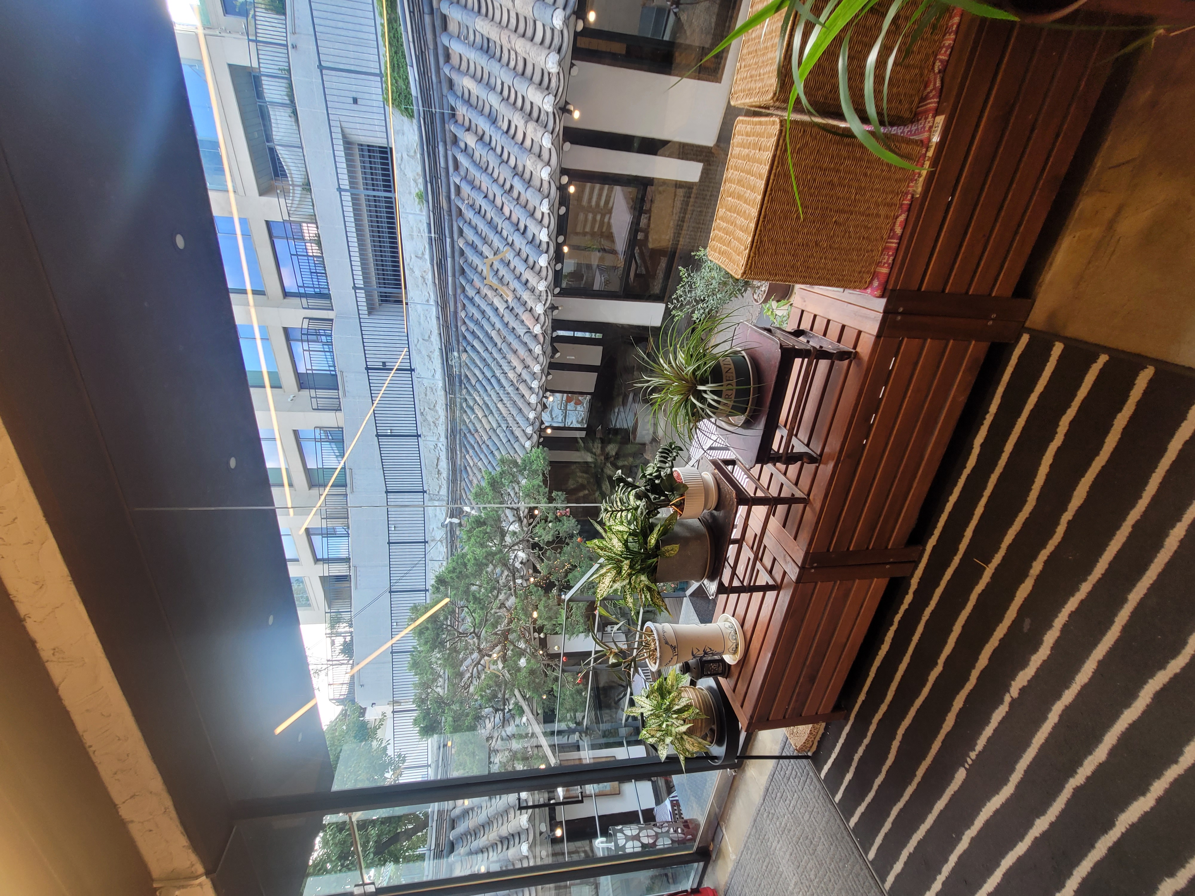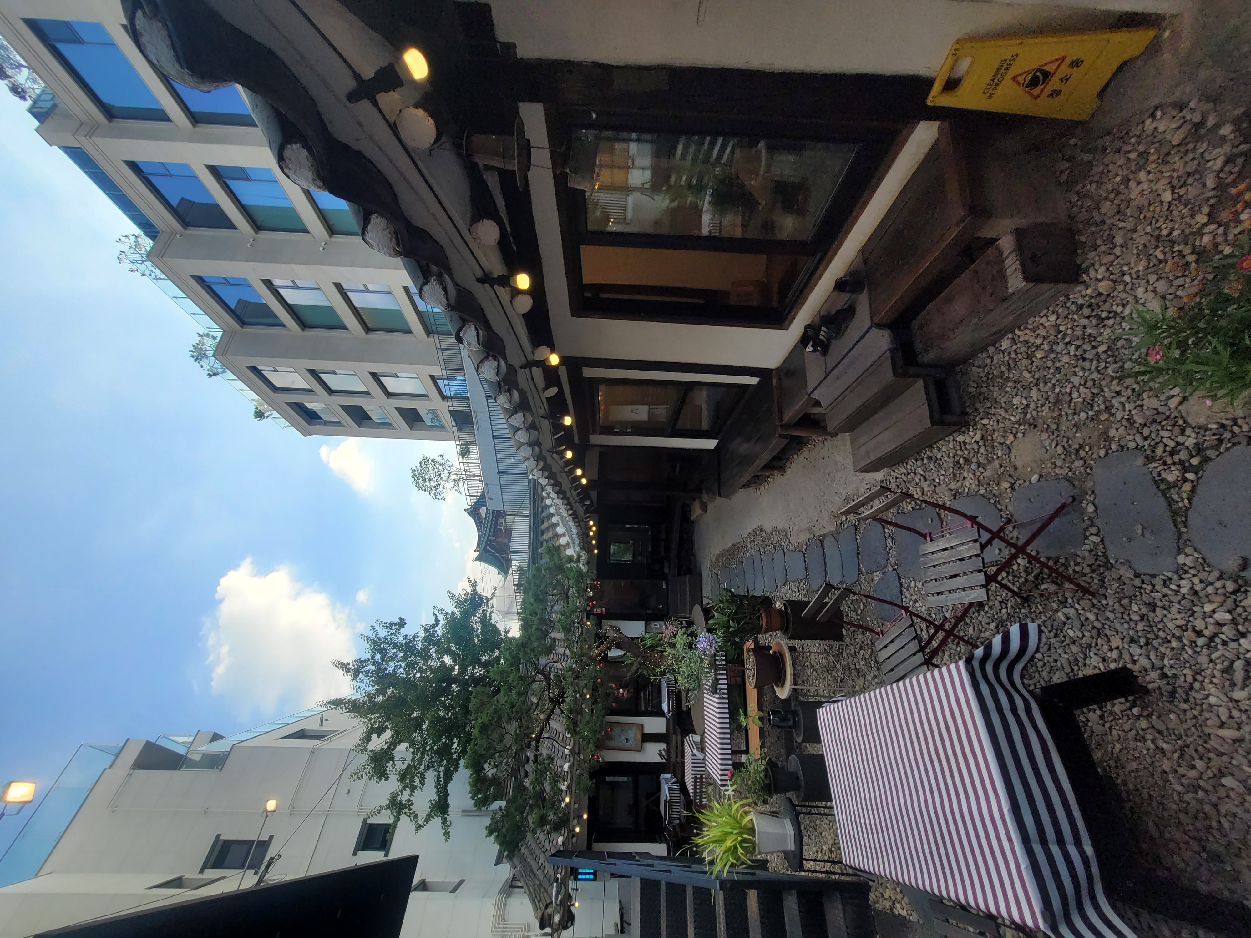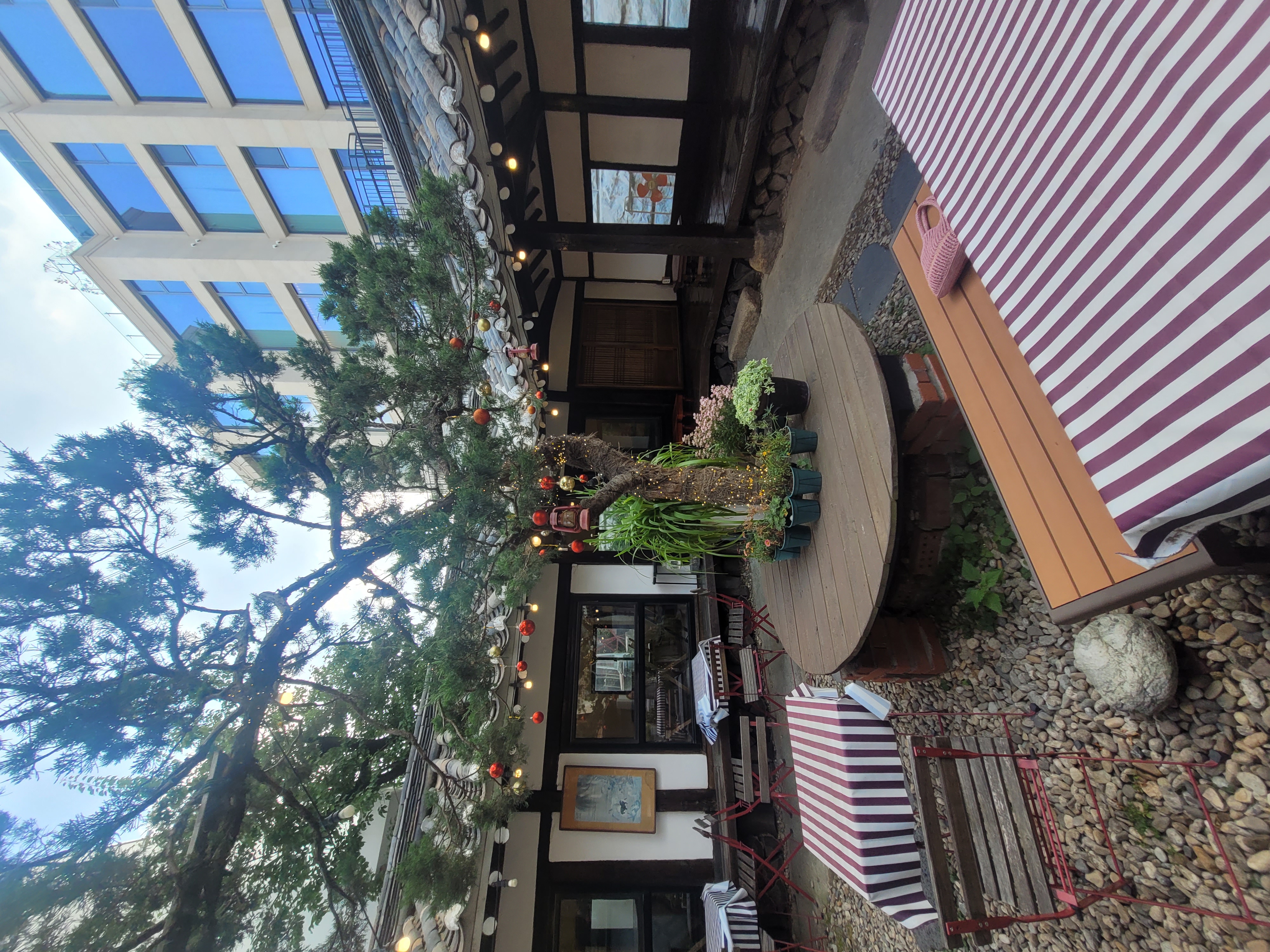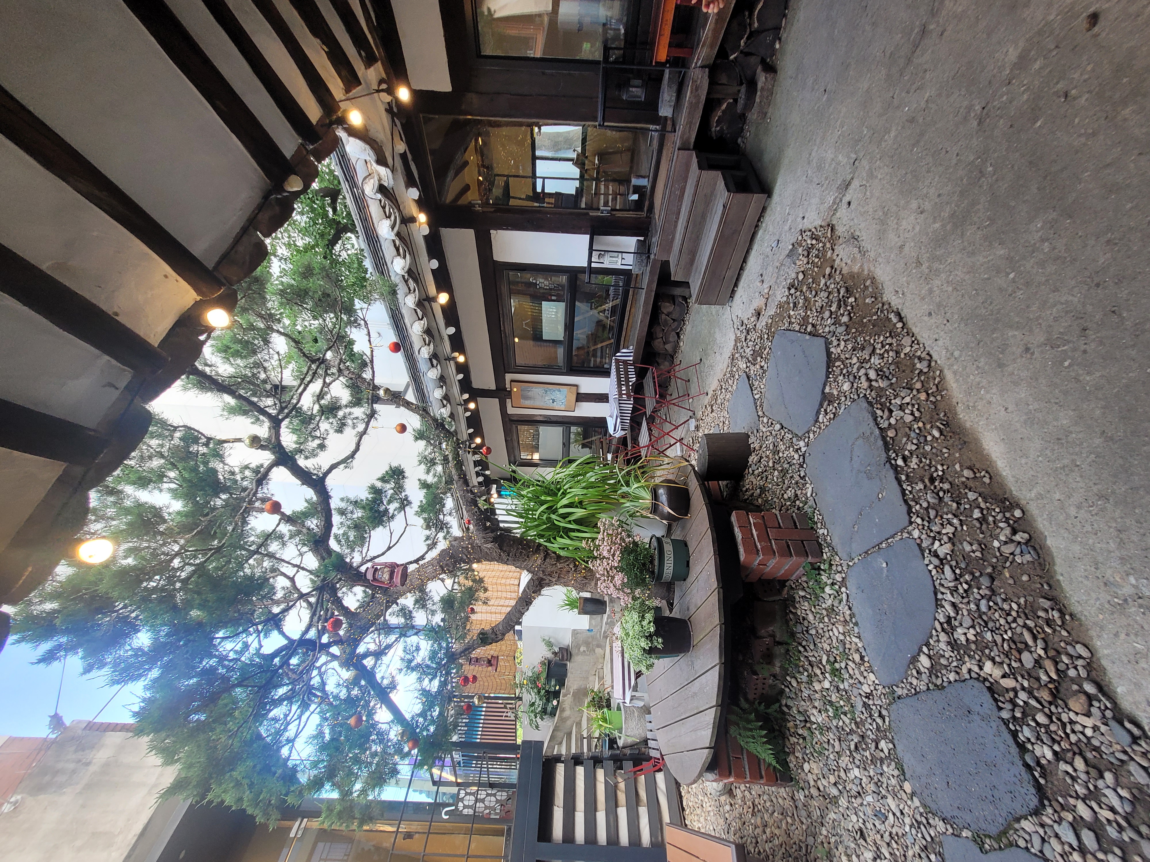 입구를 지나 마당에 들어서면, 크고 멋진 나무 한 그루와 그 주변을 감싸는 데크와 꽃 장식, 조명 소품이 따뜻한 감성을 더합니다.