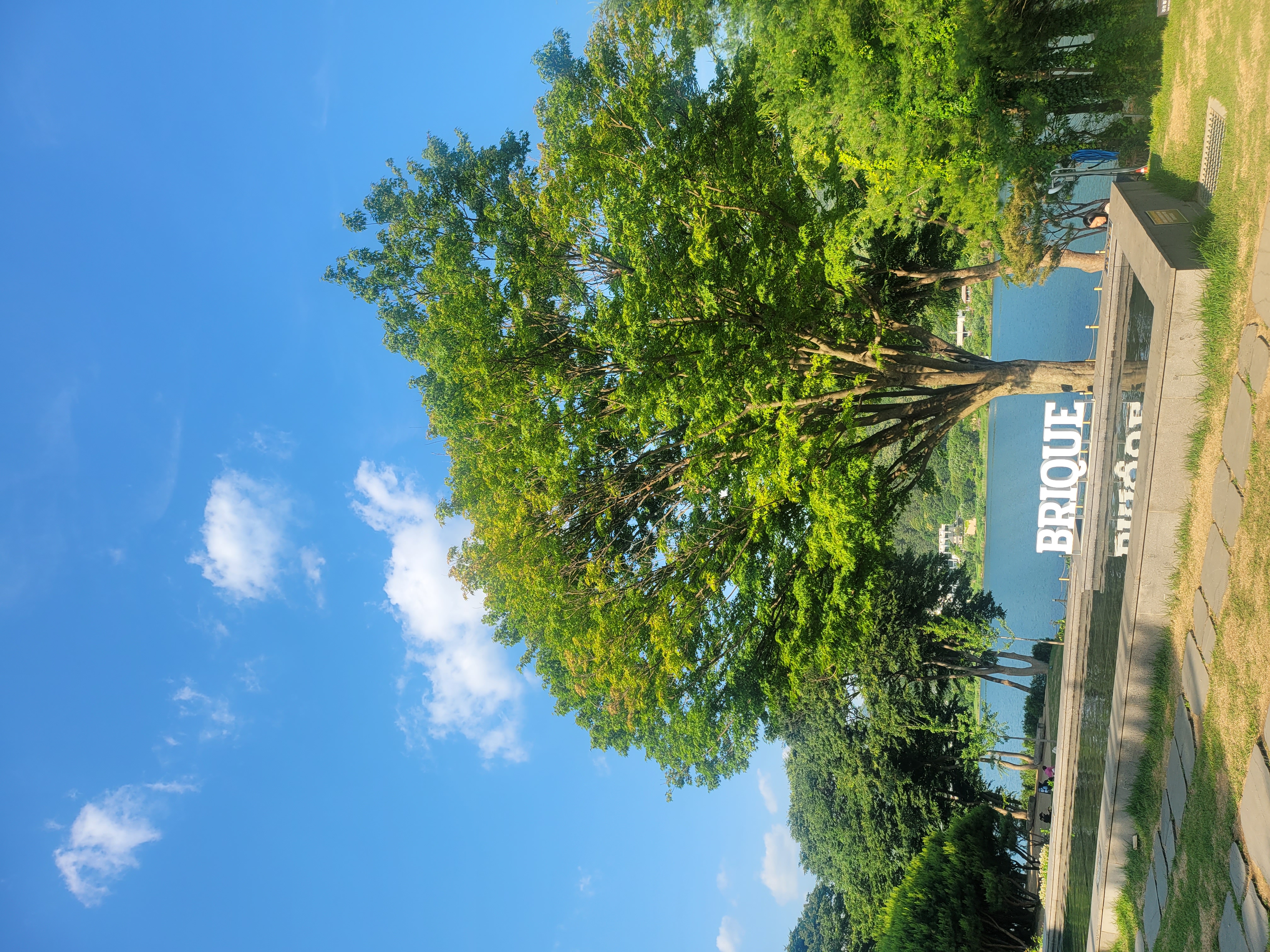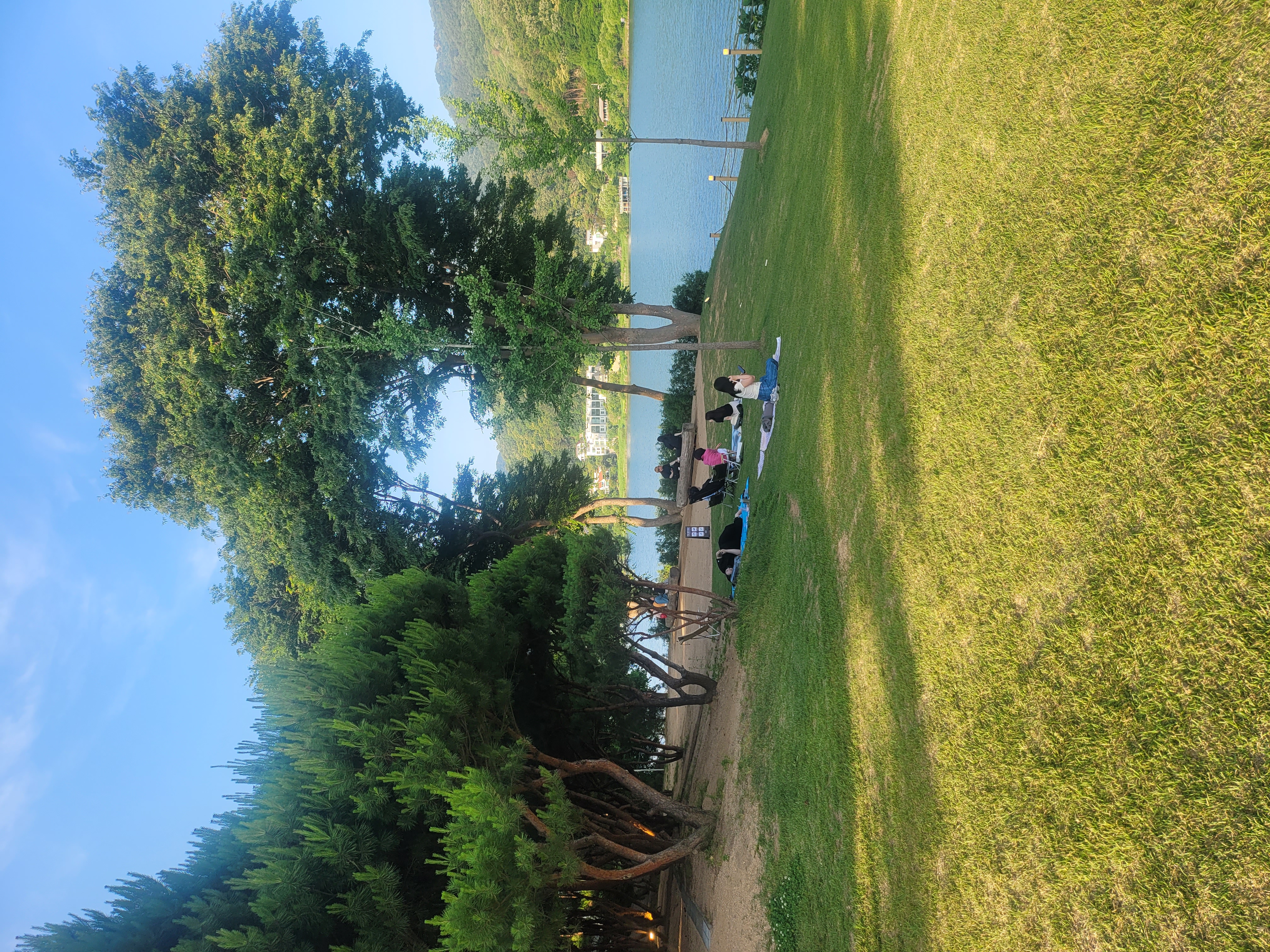 북한강 뷰를 한눈에 담을 수 있는 넓은 잔디밭, 탁 트인 하늘과 강물의 조화,