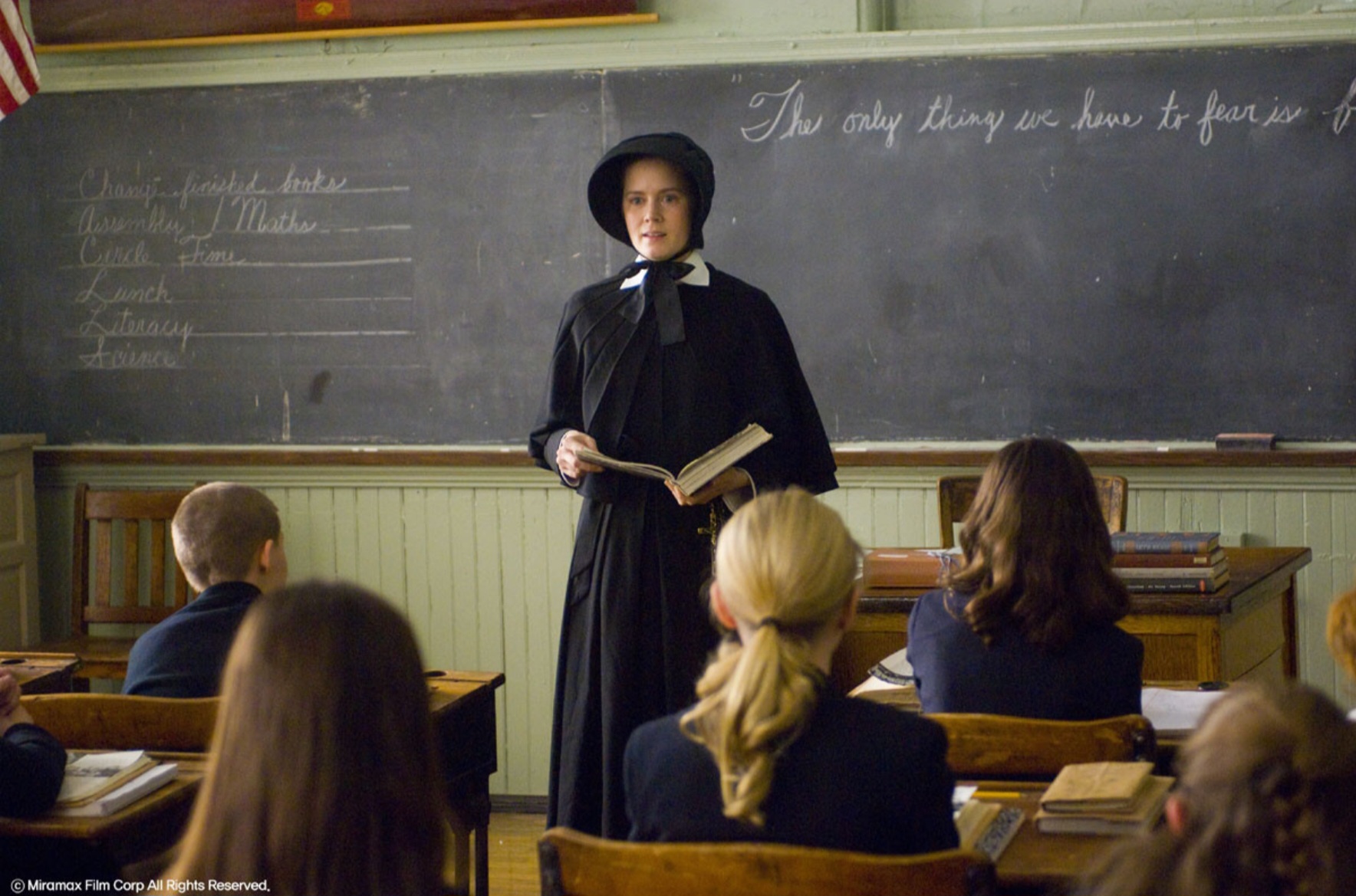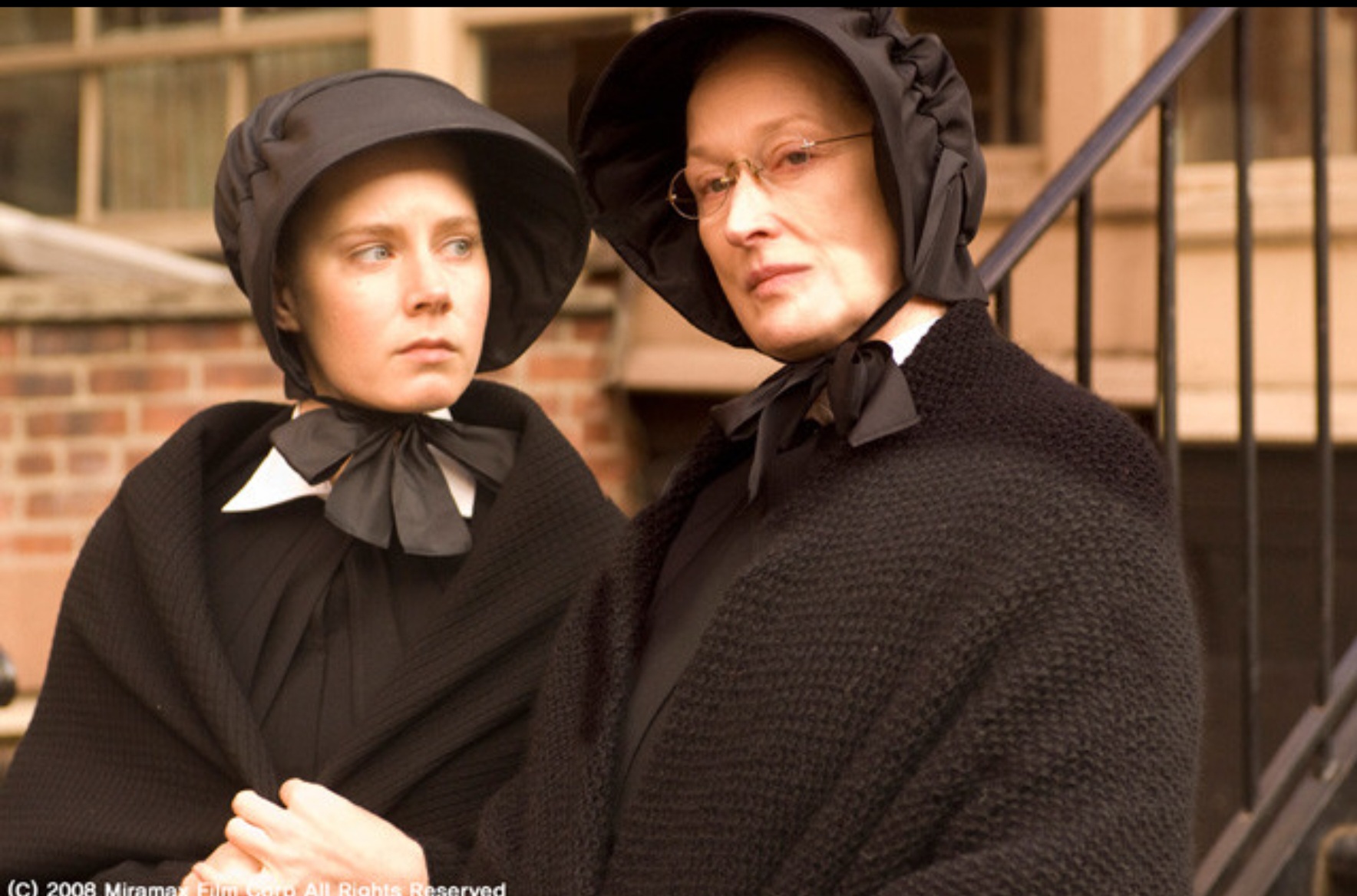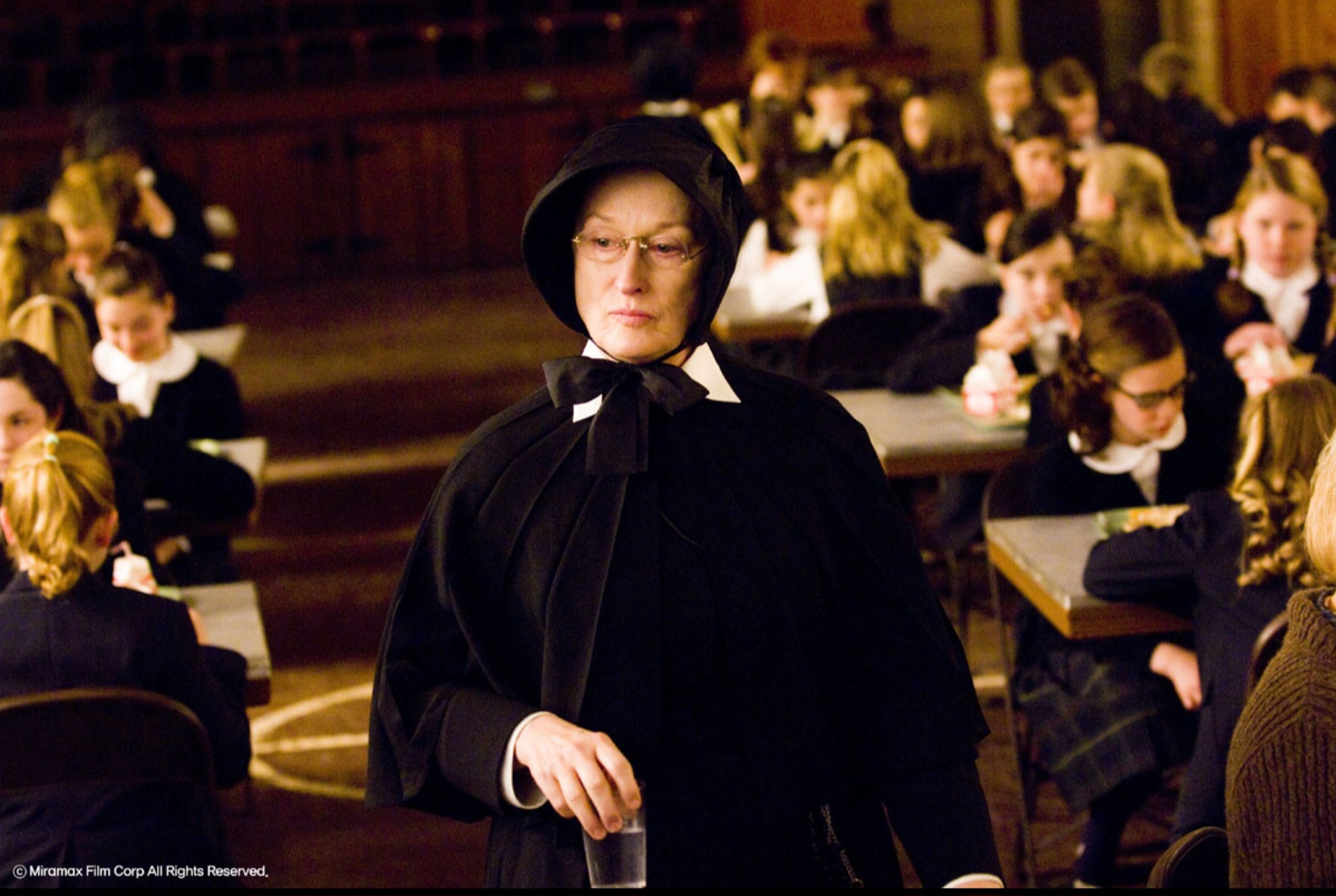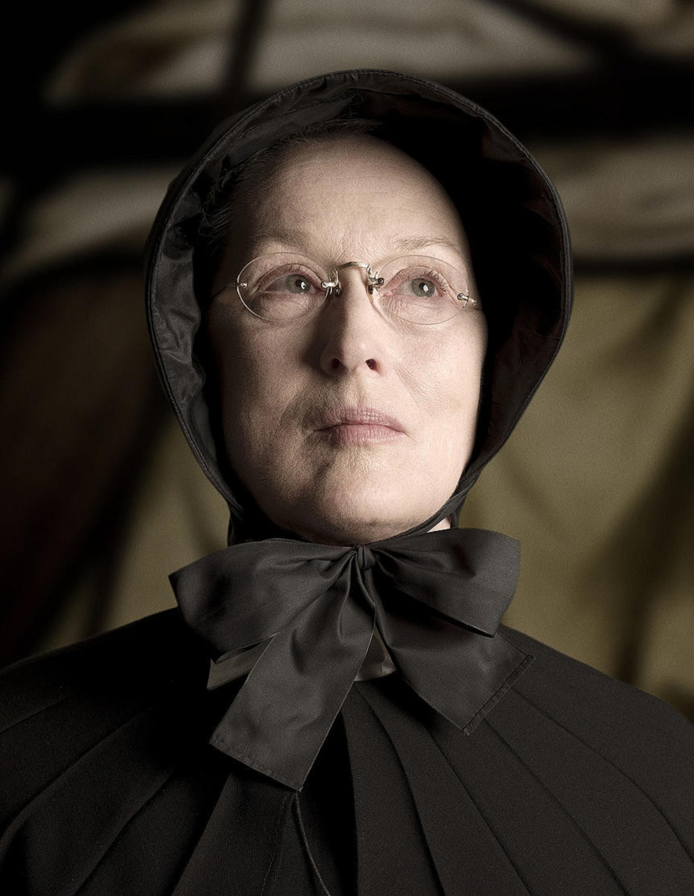 메릴 스트립은 냉혹하고 흔들림 없어 보이지만, 내면 깊숙한 곳에서 불안을 꾹꾹 눌러담은 알로이시스를 완벽하게 연기합니다.