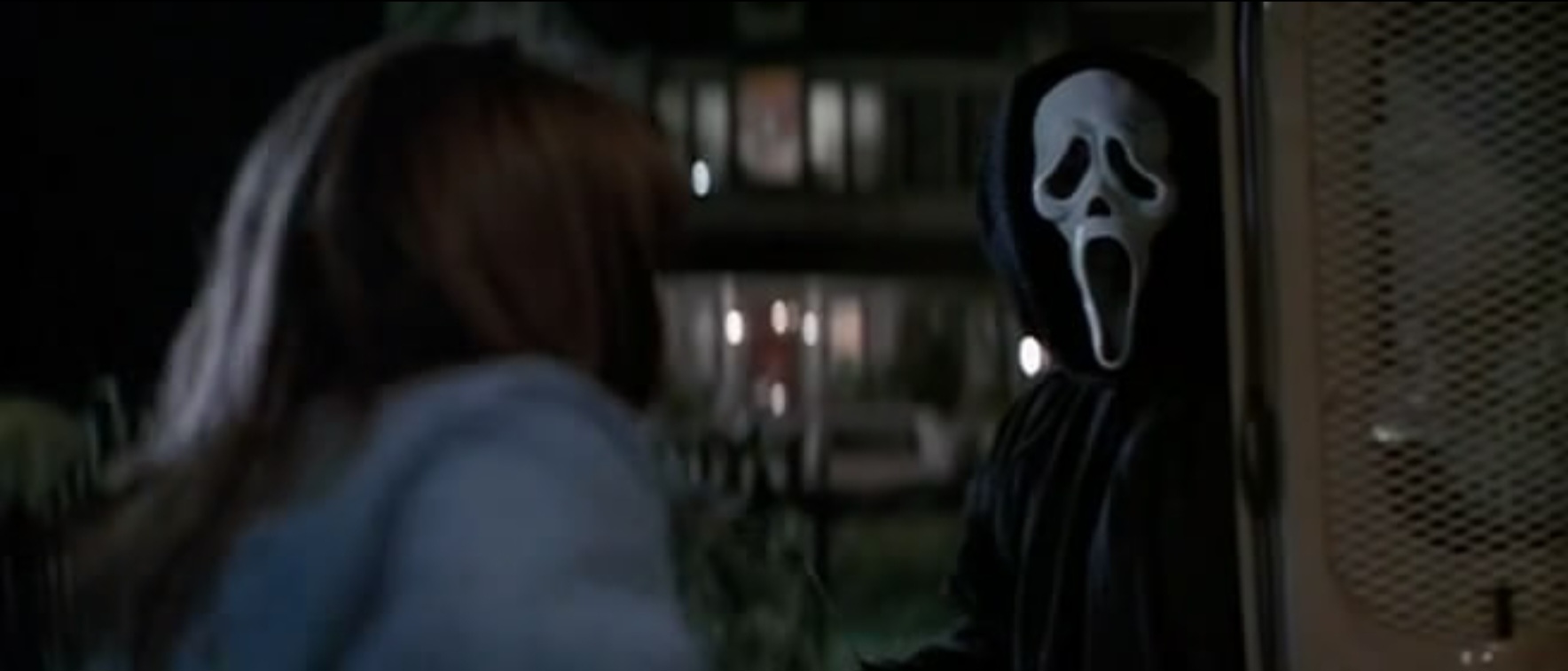 처음에는 장난인 줄 알았지만, 점점 전화는 협박과 살인을 암시하는 위협으로 변해가죠. 케이시는 남자친구를 구하고자 수수께끼에 답하려 하지만, 결국 두 사람은 비참하게 살해됩니다. 이 장면은 단 몇 분 만에 관객을 공포로 몰아넣으며, 영화의 긴장감을 단번에 높입니다. 또한 이 오프닝은 연쇄살인과 고스트페이스(Ghostface)라는 살인마의 존재를 강렬하게 각인시키죠.
