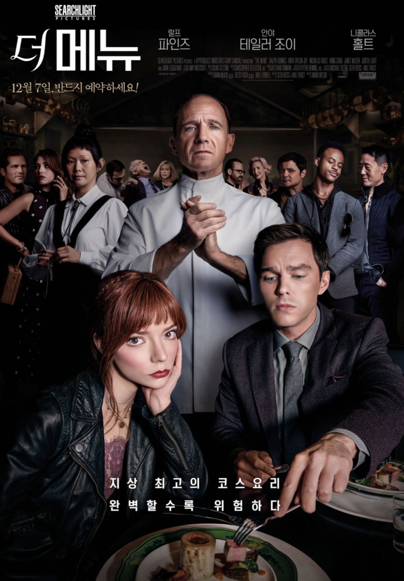 초대받은 이들은 모두 상류층 혹은 문화적 권력을 가진 인물들이다. 이들 사이에 등장한 커플 ‘타일러’와 ‘마고’. 타일러는 셰프의 철학을 숭배하는 미식가지만, 마고는 어딘가 이 공간이 불편하다. 영화는 이 불균형한 시선을 통해 관객을 서서히 긴장 속으로 밀어 넣는다.
