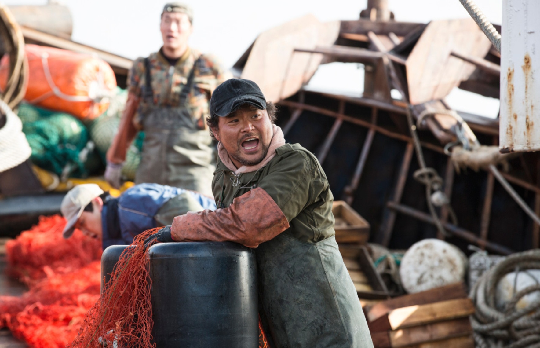 영화의 시작은 현실적이고 씁쓸합니다. 감척 사업으로 인해 생계가 막다른 선장 철주(김윤석)는 배를 잃지 않기 위해 마지막 항해를 결심합니다. 그와 함께 하는 선원들은 각자의 사연을 지닌 평범한 인물들입니다. 기관장 완호(문성근)는 인심 좋은 아버지 같고, 갑판장 호영(김상호)은 의리파지만 거칠고, 젊은 선원 동식(박유천)은 순수함을 간직한 인물로 대비를 이룹니다.