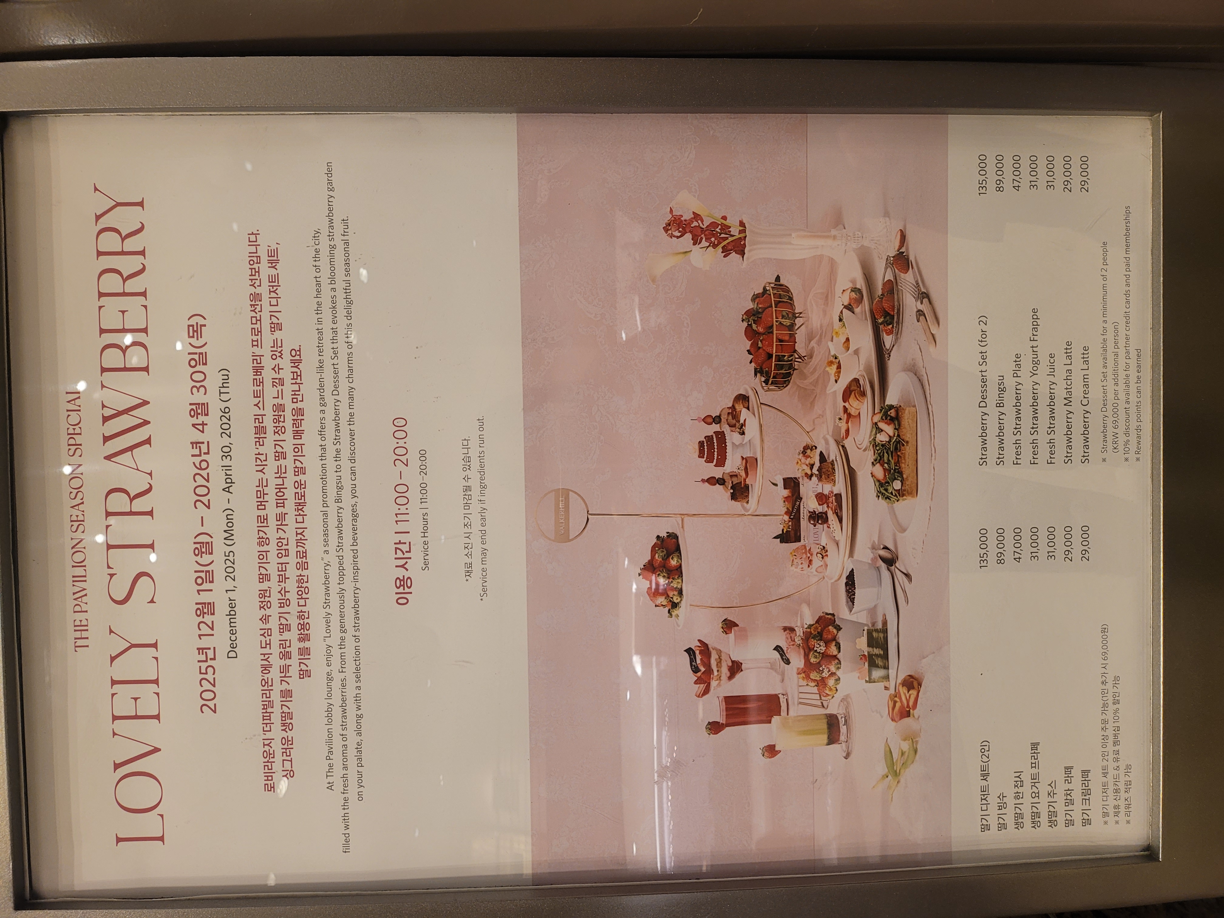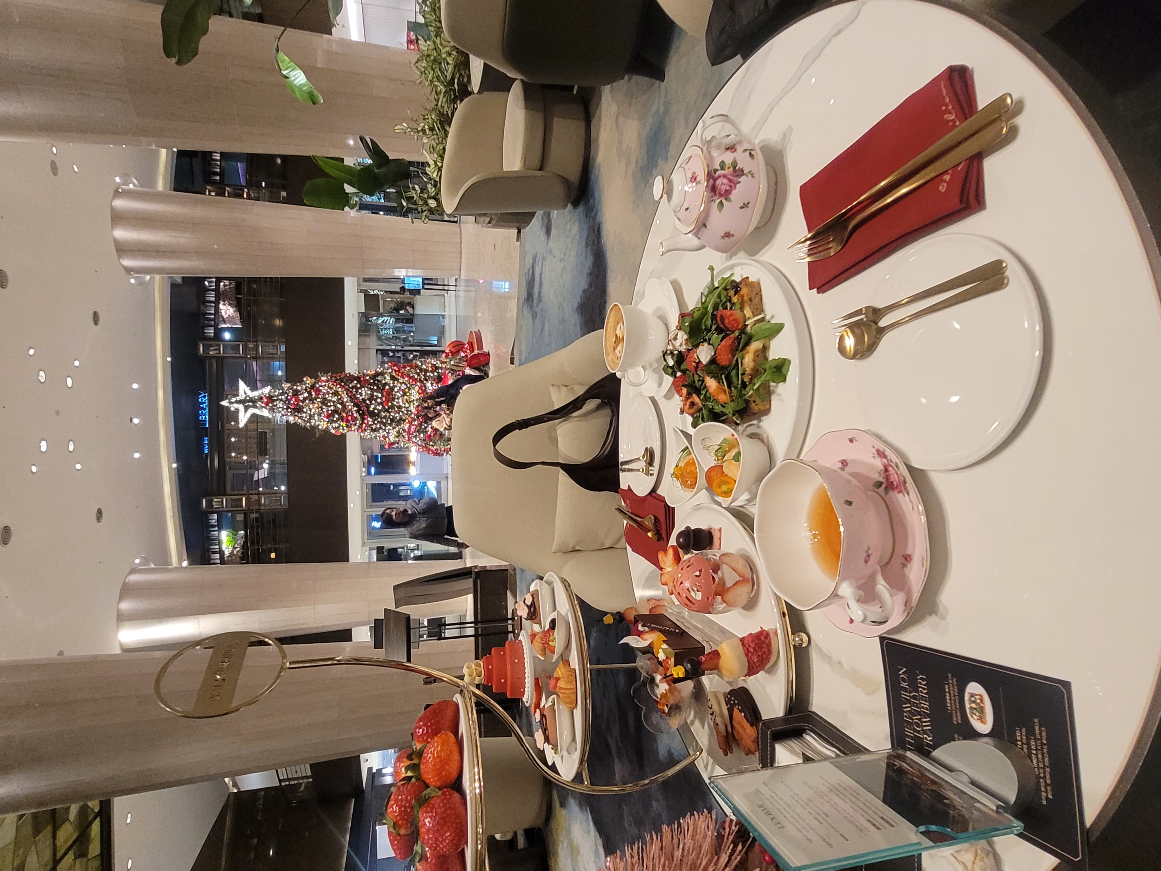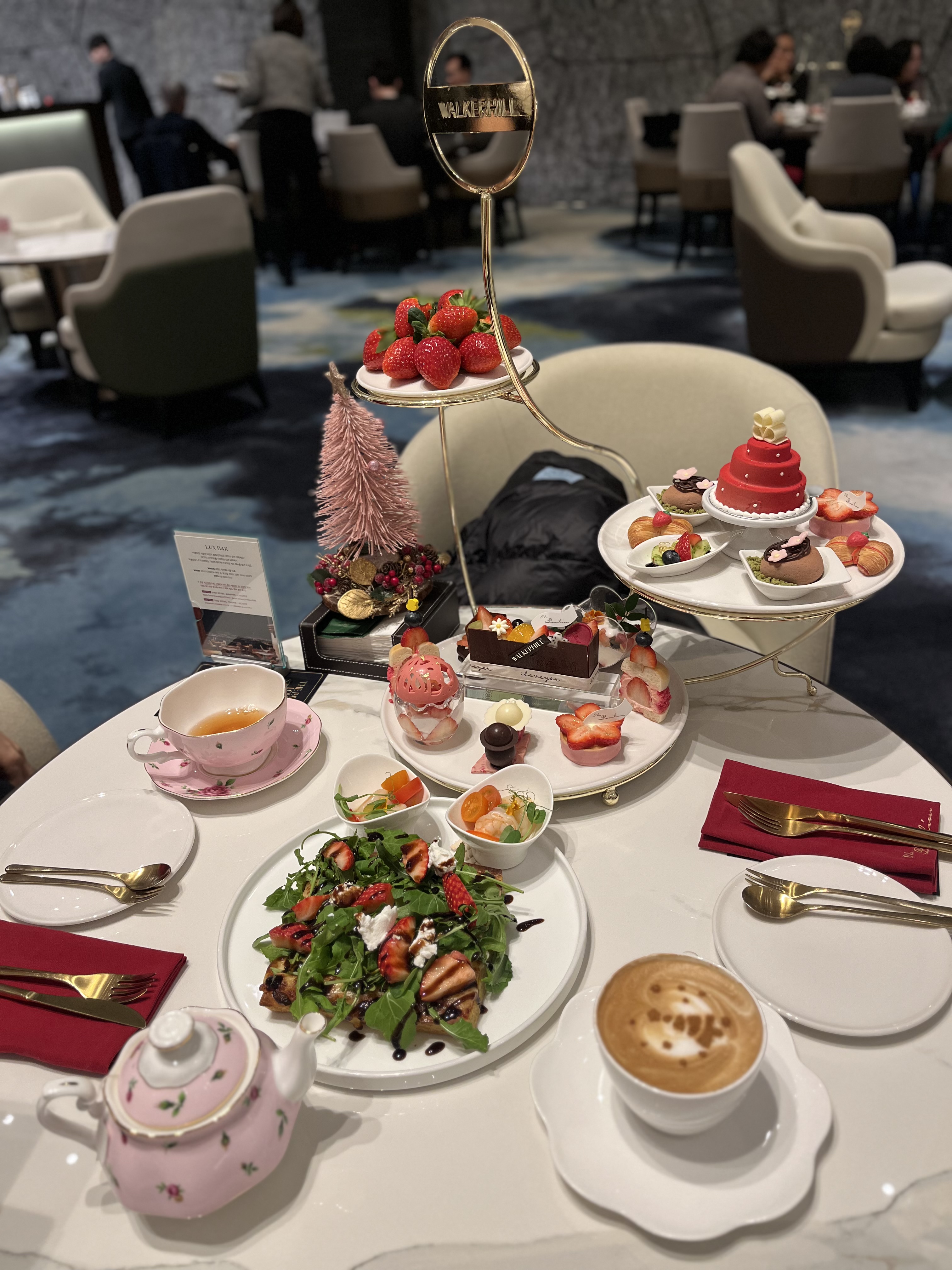 이번에 방문한 곳은 Walkerhill Hotel 더파빌리온(The Pavilion) 라운지입니다. 호텔 로비에 위치해 있지만 생각보다 조용하고 차분한 분위기였어요. 테이블 간 간격도 넉넉해서 주변 신경 쓰이지 않고 편하게 시간을 보낼 수 있었습니다. 연말·겨울 시즌답게 은은한 딸기 무드의 디스플레이도 잘 어울려서, 앉아 있는 것만으로도 기분이 좋아지는 공간이었어요.