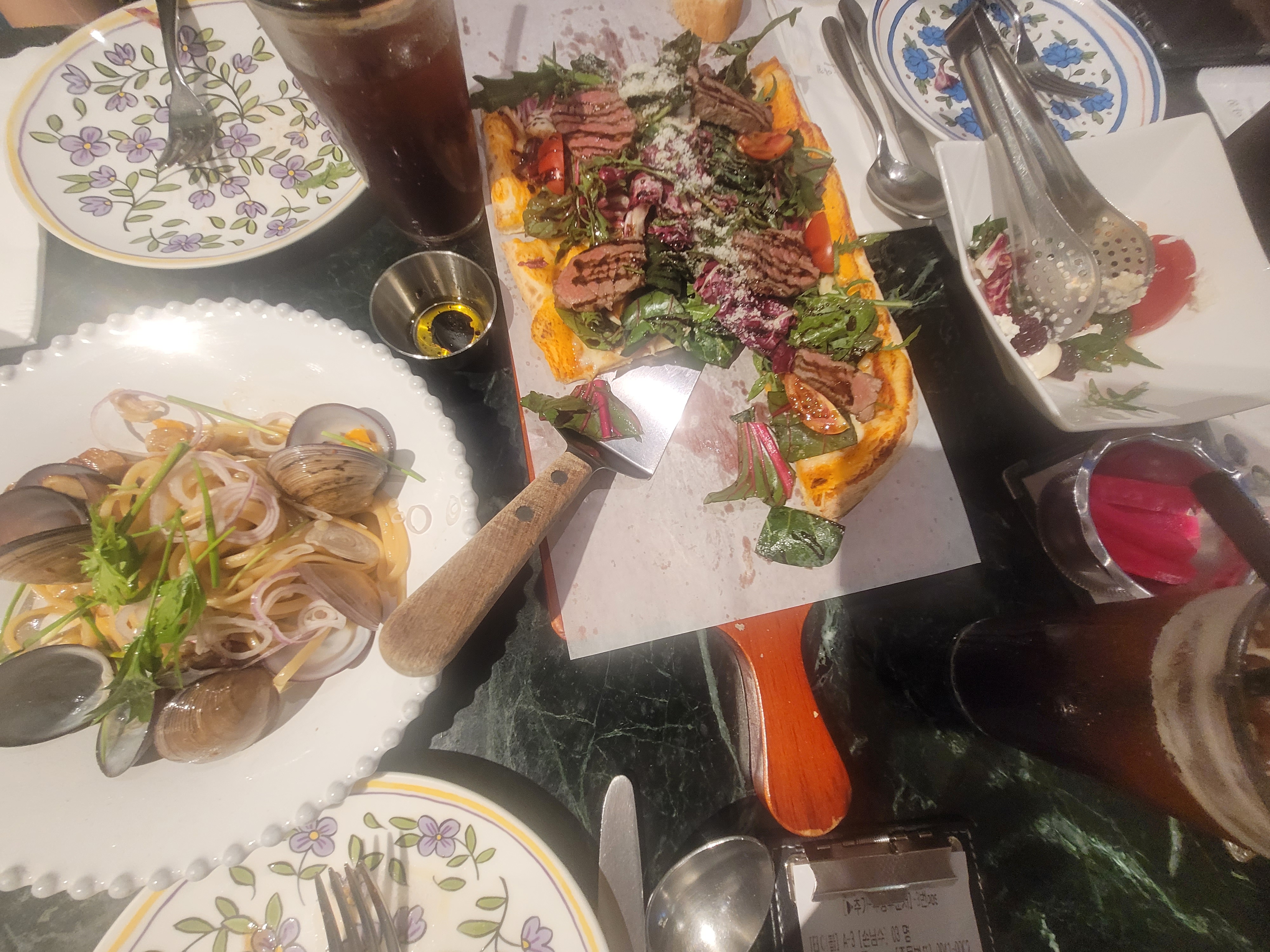 봉골레 파스타는 바지락의 깊은 풍미와 알싸한 마늘 향이 어우러져 입안 가득 바다의 향을 느끼게 했고, 스테이크는 육즙 가득 부드러워 만족도가 높았습니다.