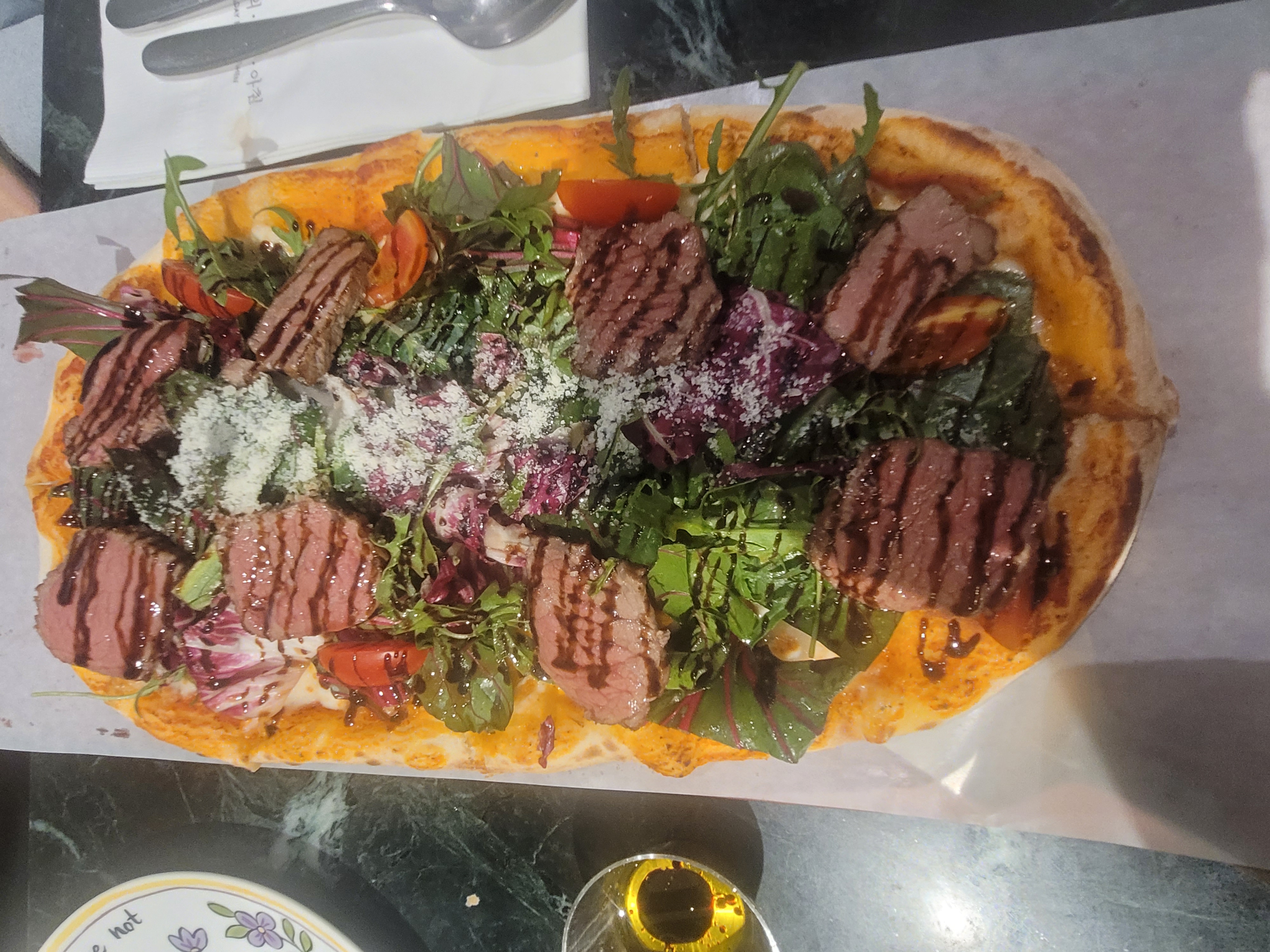 스테이크피자는 치즈가 진하고, 도우는 바삭!