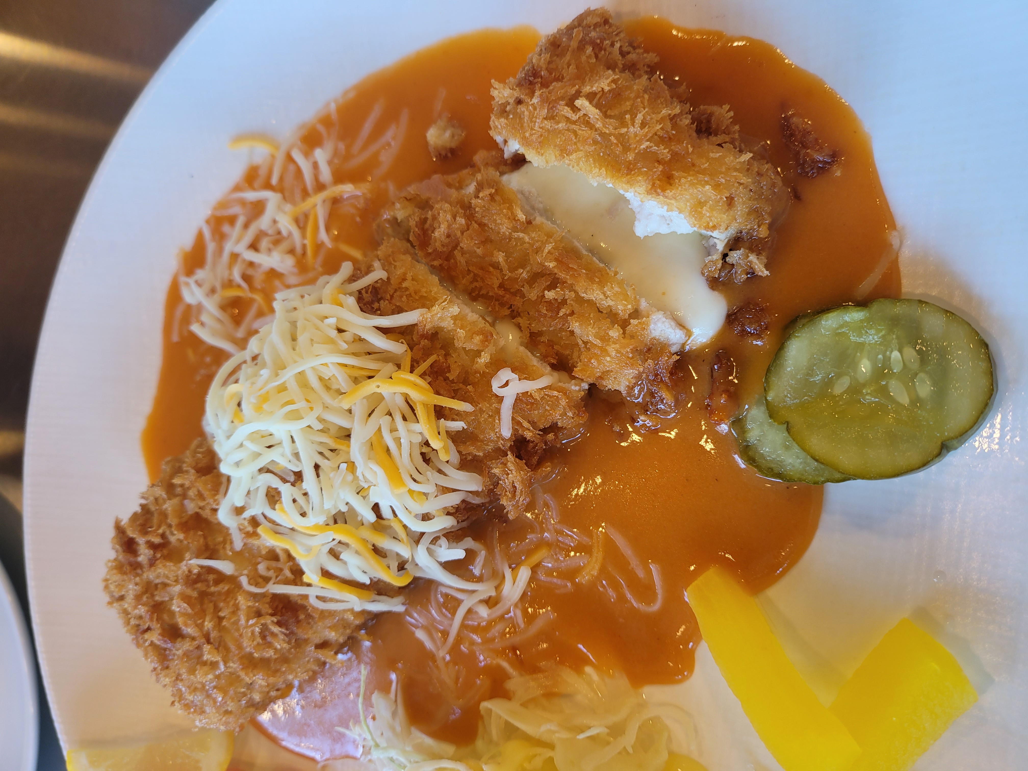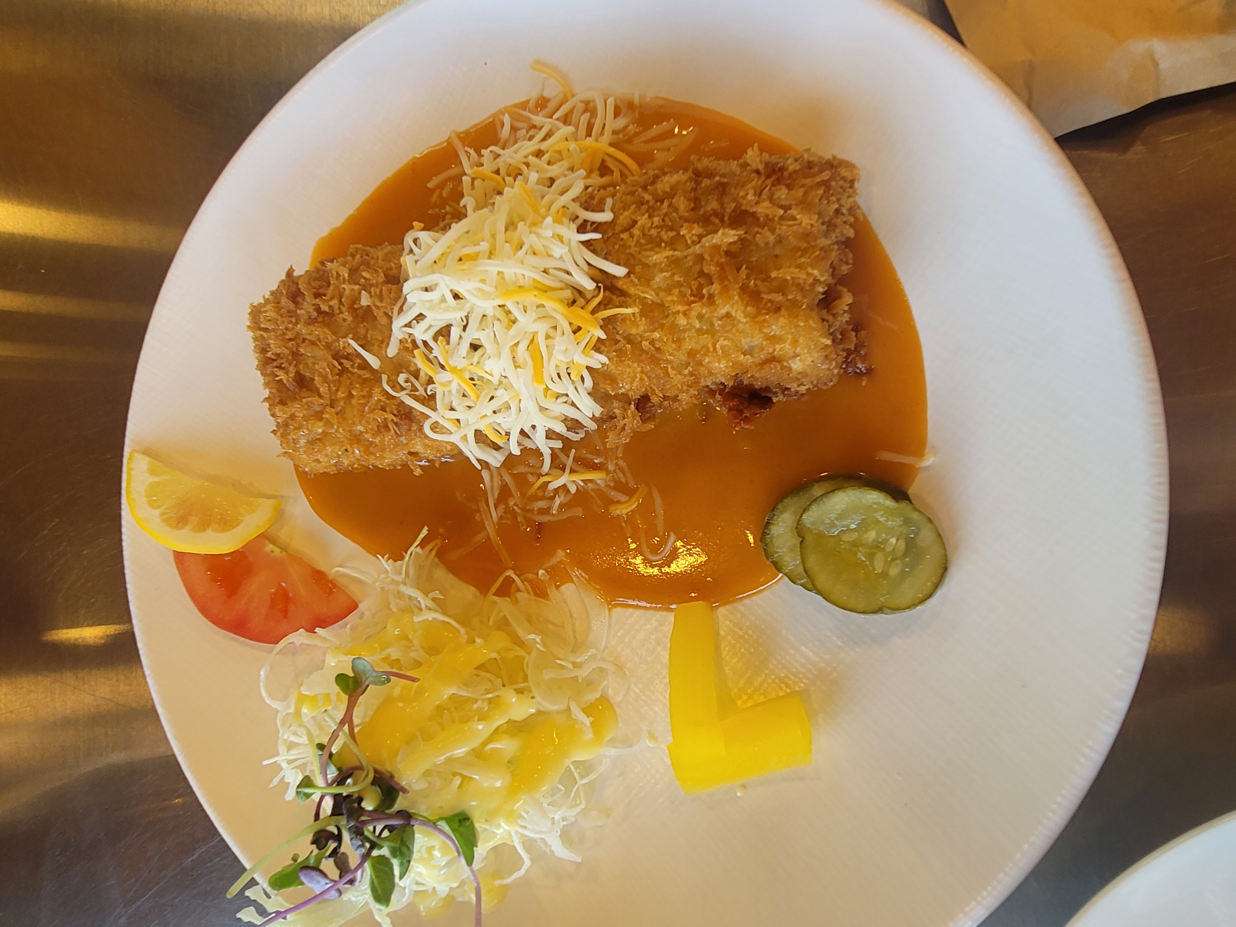 이 집의 치즈 돈까스는 정말 일품이에요. 겉은 바삭하고 속은 촉촉한 고기에 쭉쭉 늘어나는 고소한 치즈가 어우러져 입안에서 환상의 조화를 이룹니다. 고기 두께도 넉넉하고 잡내 없이 깔끔하게 튀겨져 있어서 첫 입부터 마지막 한 조각까지 만족스럽게 먹을 수 있었어요.