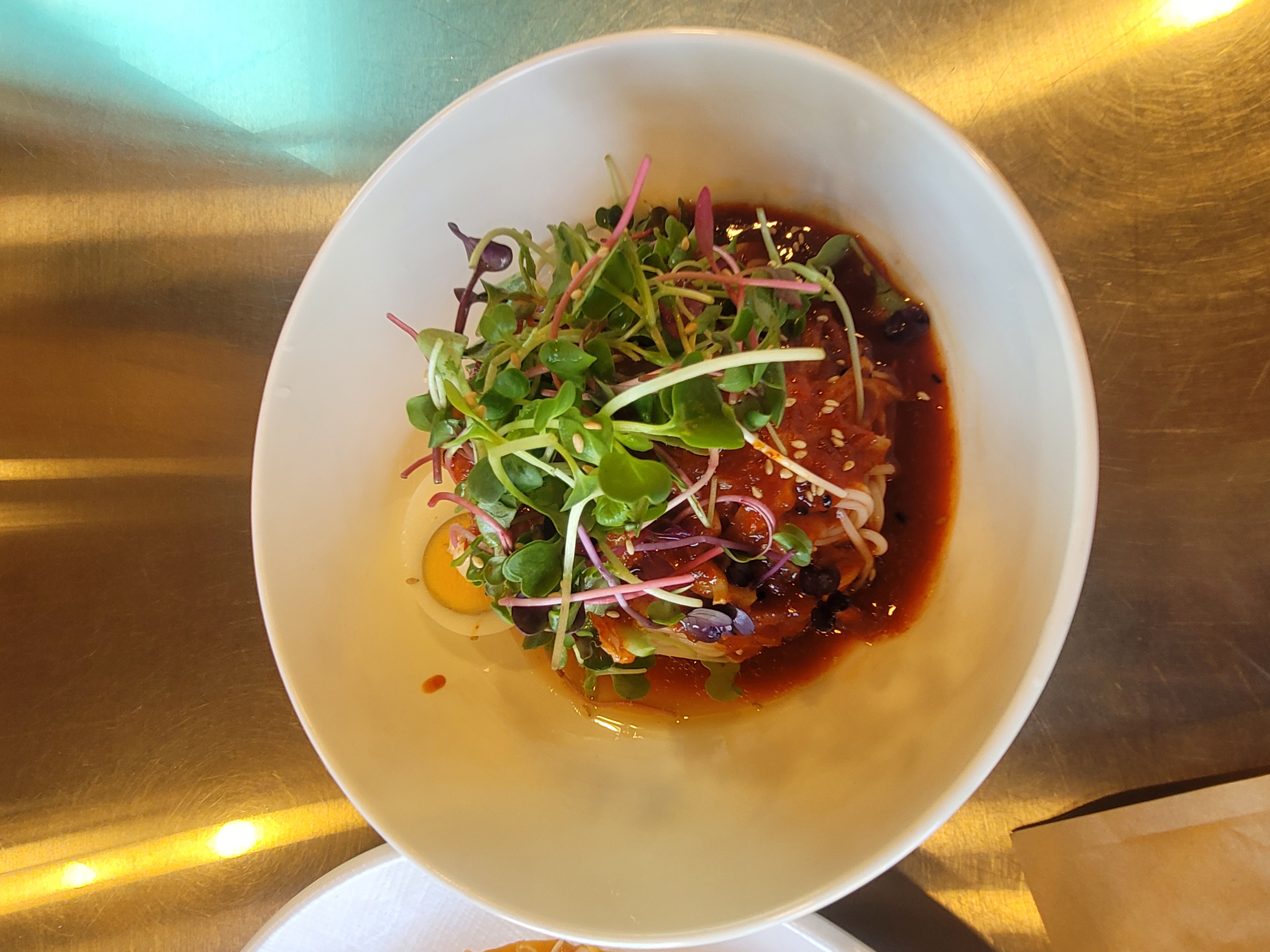 사이드 메뉴로 주문한 비빔국수도 이 집의 강력 추천 메뉴예요. 살짝 매콤하면서도 새콤달콤한 양념이 탱글한 면발에 잘 배어 있어, 입맛 없을 때도 한 그릇 뚝딱 가능한 매력적인 메뉴예요. 육수가 살짝 얼린 스타일이 아니라서 오히려 비빔 양념의 풍미가 진하게 느껴지는 정통 비빔국수를 맛볼 수 있었어요.