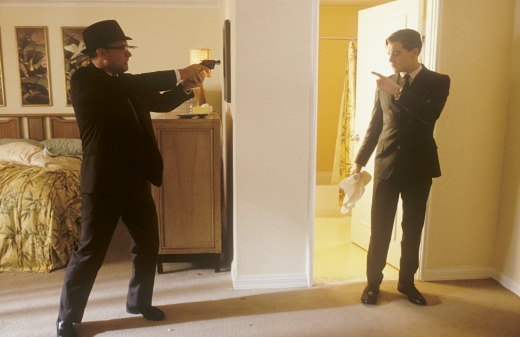 특히 유명한 호텔 장면. 칼이 프랭크를 처음으로 덮치는 순간, 관객은 ‘드디어 잡혔구나!’ 하고 숨을 죽인다. 하지만 프랭크는 오히려 FBI요원인 척하며 수표를 챙겨 들고 태연하게 빠져나간다. 이 장면이 주는 쾌감은 영화 전체를 관통하는 리듬을 상징한다. 칼은 언제나 한 박자 늦고, 프랭크는 언제나 예상 밖에서 빠져나간다.