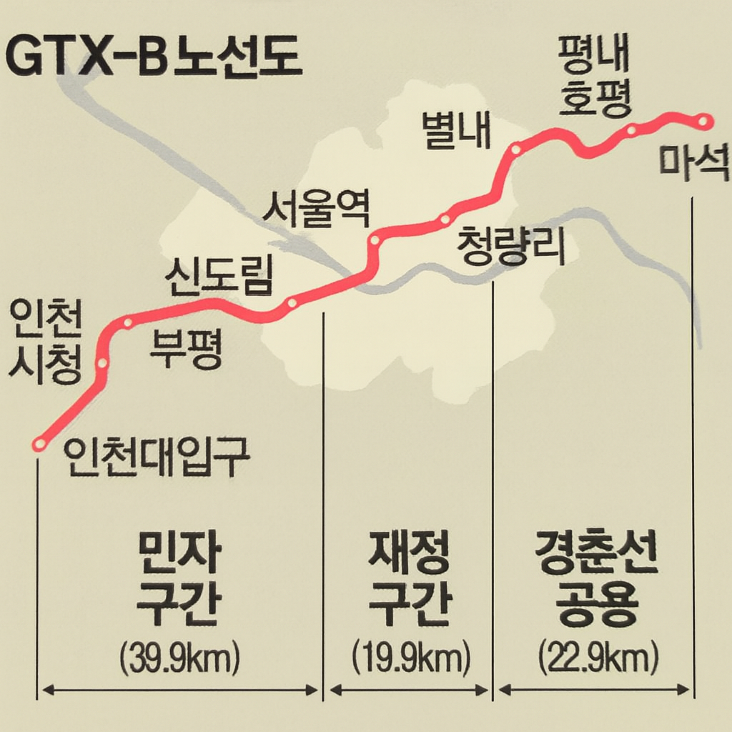 GTX-B 노선 사업이 3조 규모 PF(프로젝트 파이낸싱) 체결과 함께 본격적으로 추진됩니다. 인천 송도에서 출발해 여의도, 용산, 청량리, 남양주를 거쳐 마석까지 이어지는 총 연장 82.8km 구간으로, 2031년 개통을 목표로 하고 있습니다.